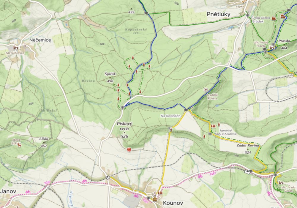 Geolog Václav Cílek se v článku Lovci menhirů v časopise Vesmír (2014) věnuje dvěma sousedním lokalitám u Kounova. První je v lese, v údolí pod Špičákem, severně od silnice Pnětluky-Kounov, kde existuje několik krátkých a nepravidelných kamenných řad. Kameny-menhiry jsou silicifikované třetihorní pískovce, některé větší než lidská postava. Zde „lovci menhirů“, jak nazývá skupinu dobrovolníků – v prozaické autobiografi je představila Hana Jakovcová, (2014,176 s.) – odkryli snad stovku a vztyčily přes desítku masivních křemencových kamenů přirozeně se vyskytujících v půdě. Na rozdíl od druhé lokality, známějších Kounovských řad, kam byl kamenný materiál (sluňáky) v archeologické době přinesen, tvoří křemenec přirozený denudační materiál Špičáku (n.v. 490 m). U vztyčených kamenů neexistuje žádný archeologický důkaz jejich stáří.