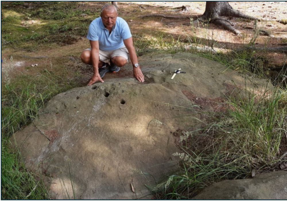 Oficiální výklad na doprovodné tabuli předpokládá, že jamky byly vytvořeny jako záseky na jeho rozdělení před těžbou. Autor se pokusil pro čtyři čtyřhranné jamky s miskou najít jiné (možné archeoastronomické) vysvětlení. „Lovci menhirů“ pojmenovali tento kámen Dírák, je v n. v. 400 m, s pozicí na mapě cca 50.2385683N, 13.6702036E. Jihovýchodně od něj je mírné stoupání k silnici mezi Pnětluky a Kounovem (na 430 m n.m.), od silnice pak prudší k lokalitě Na rovinách (500 m n.m.) kde se nacházejí Kounovské kamenné řady. Protože je kámen o 100 m n.v. „utopený“ v lese, chybí odtud výhled na východní a jižní obzor, resp. na východy Slunce a vytesané struktury proto nesou symboliku spíše lunární než solární.