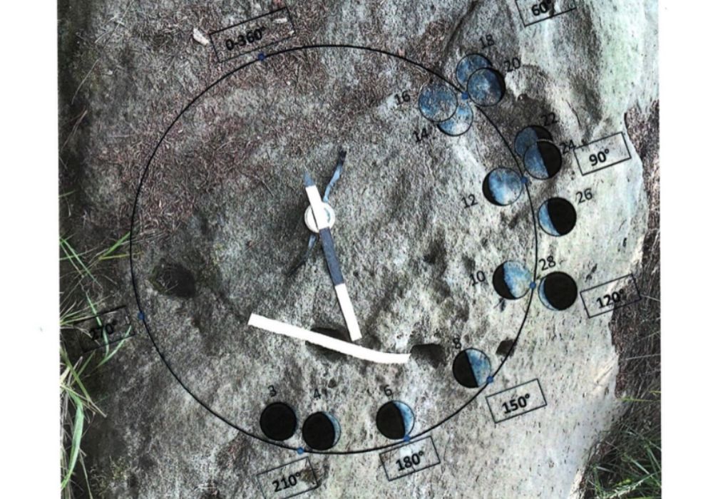 Pokud si při analýze povrchu zorientujeme plochý kámen podle zeměpisných souřadnic – miska se octne na východě (90°) a čtvrtá krajní hranatá jamka na západě (270°). Pro další tři lze najít na fotografii několik geometrických směrů: a, ve směru od misky se ocitnou v rozevřeném 40° úhlu orientovaném jz, b, jejich vzájemným propojením získáme směr sz – jv (osa 315°- 135°). Porovnáním vyhledaných směrů s modelem měsíčního cyklu (článek teoretický model měsíčního cyklu) by 3 jamky v případě a představovaly vycházející Měsíc nad jihozápadem, v případě b je miska (nad spojnicí hranatých jamek) označením světlých nocí nad osou sz – jv zahrnující východy M. kolem úplňku (12-22 noc od novu).